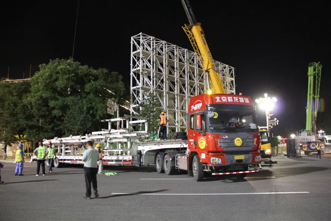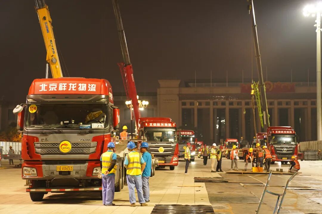 自6月24日起,祥龙物流集团陆续完成特定区域物资转场运输,完成长安街及广场各要素物资的三次进、撤场运输演练。进场运输阶段,累计投入自有及外协车辆1063部,完成3196车次运输任务,投入人力8000余人次,高效完成各类物资运输。8月20日至22日,保障任务迎来48小时集中进场关键阶段。面对暴雨等不利因素的考验,各小组、各单位通力配合,现场管理、调度、点位、司装等作业人员克服重重困难,一刻不停冒雨作业,共计投入车辆500余辆、1062车次、投入人力1500余人次,按时圆满完成了所有物资进场任务,为后续物资快速搭建、项目完美呈现抢出了宝贵的时间余量。